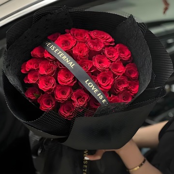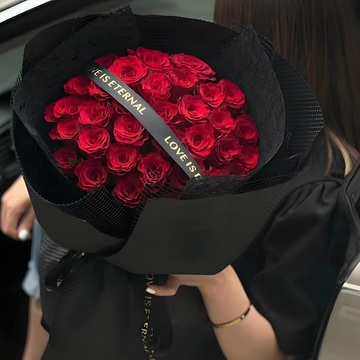 精美韩式黑色包装花语:千百朵玫瑰在时间中褶皱,褪色。千百句温柔的蜜语在时间中淡忘,消逝,只有我对你的爱在时间中不变,永驻。附送: