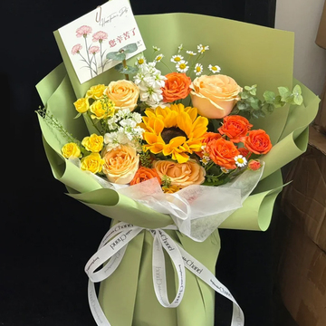 4朵香槟玫瑰,1支向日葵,4支橙芭比,2支黄色泡泡,2支白色紫罗兰,洋甘菊、尤加利间插