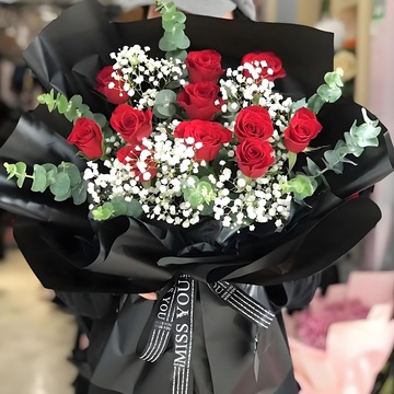 11朵红玫瑰,白色满天星和尤加利搭配