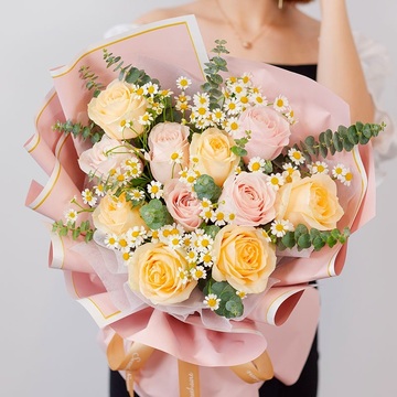 6朵香槟玫瑰,5朵戴安娜,白色洋甘菊间插,尤加利