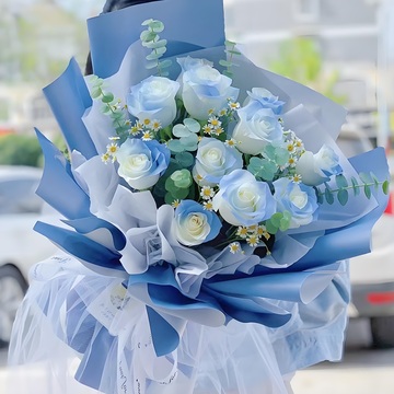 11朵碎冰蓝玫瑰,洋甘菊、尤加利间插