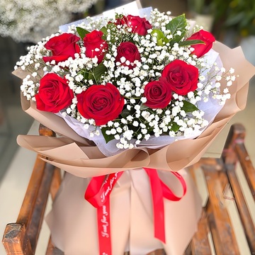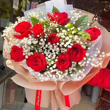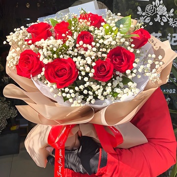 11枝红玫瑰,白色满天星丰满,栀子叶搭配