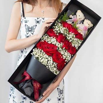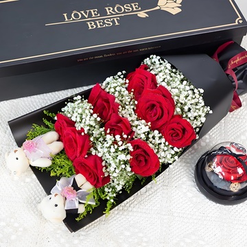 11朵红玫瑰,白色满天星丰满,1对小熊,黄英搭配