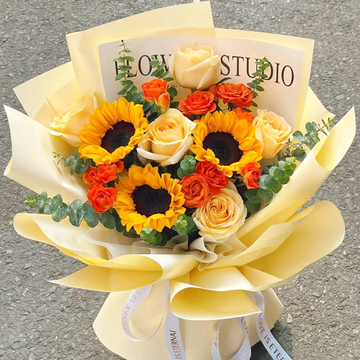 5支香槟玫瑰,3支向日葵,3支橙芭比泡泡,10支左右尤加利叶丰满