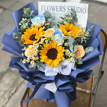 3朵香槟玫瑰,3朵碎冰蓝玫瑰,3支向日葵,洋甘菊丰满间插,蓝星花,尤加利搭配