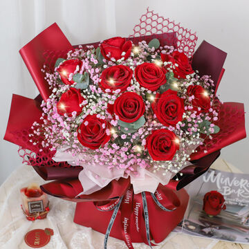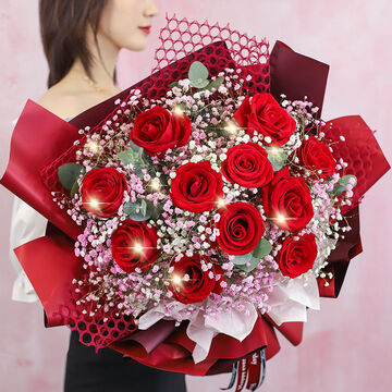 11朵红玫瑰,粉色满天星丰满,一条灯带