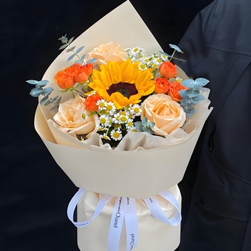 1支向日葵,3朵香槟玫瑰,橙色芭比适量,洋甘菊、尤加利搭配