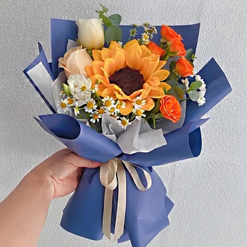 1支向日葵,2朵香槟玫瑰,橙色芭比适量,1支白桔梗,洋甘菊、尤加利搭配