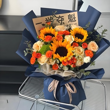 蓝色欧雅纸层次扇形包装花语:心向骄阳,金冠绽放,一举夺魁展风华。附送: