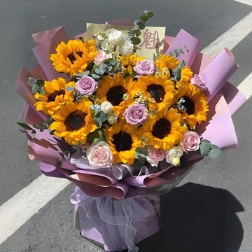 10支向日葵,3朵紫玫瑰,3朵戴安娜,白色桔梗,尤加利丰满搭配