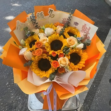 6支向日葵,6朵香槟玫瑰,白色桔梗,3支橙色泡泡,尤加利丰满搭配