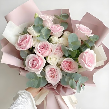 11朵粉雪山,4支白桔梗,尤加利间插