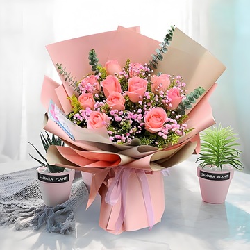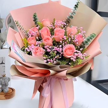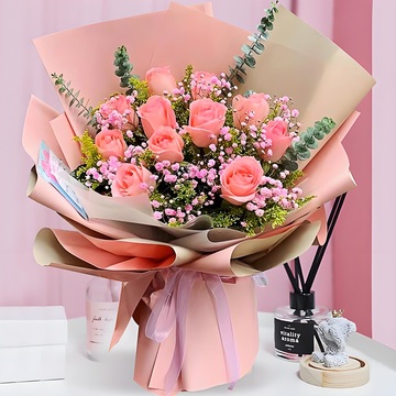 11朵戴安娜粉玫瑰,粉色满天星丰满间插,黄英、尤加利搭配