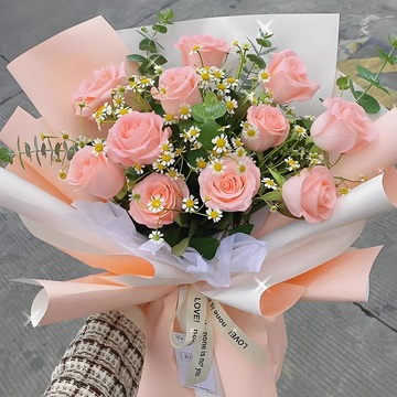 戴安娜粉玫瑰11枝,搭配洋甘菊和尤加利。