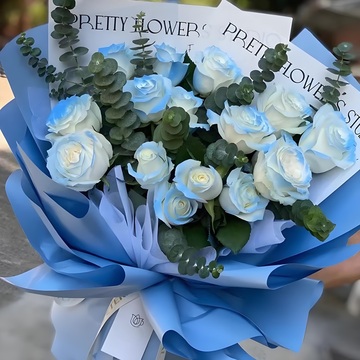 内衬白色雪梨纸,外层蓝色欧雅纸层次包装花语:你的犹豫期已经超过,不许三心二意了!从今天起,只许温柔体贴,不许横行霸道;只许爱,不许恨;只许笑,不许哭。附送: