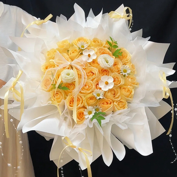 33朵香槟玫瑰,2朵白桔梗,6朵白色小雏菊,2朵永生紫罗兰