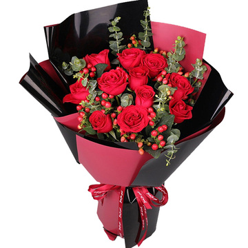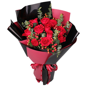 黑色及酒红色双面欧雅纸层次圆形包装,红色英文缎带束扎花语:爱是晴天雨天的相扶相伴;是自得潦倒的彼此牵挽。附送: