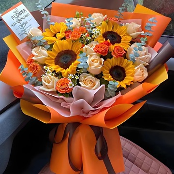 11朵香槟玫瑰4支向日葵,3支橙色芭比,尤加利叶,白色洋甘菊