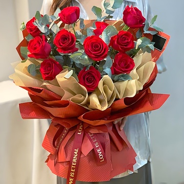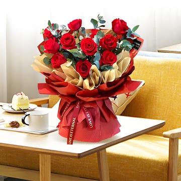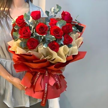 黄色绵纸内层,外层大红色纸层次圆形包装,红色缎带束扎花语:看到你,我怕触电;看不到你,我需要充电;如果没有你,我会断电。附送: