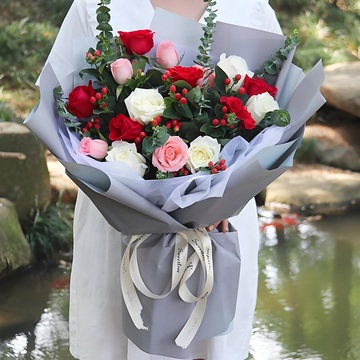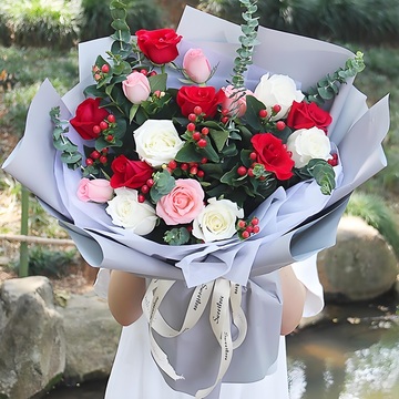 6朵红玫瑰5朵白玫瑰5朵戴安娜,尤加利丰满间插,搭配红豆