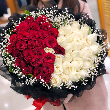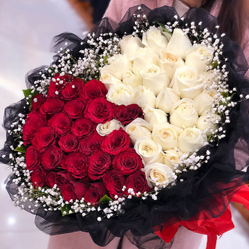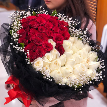 52朵混色玫瑰做成心形(26朵红+26朵白),白色满天星丰满围边,栀子叶搭配