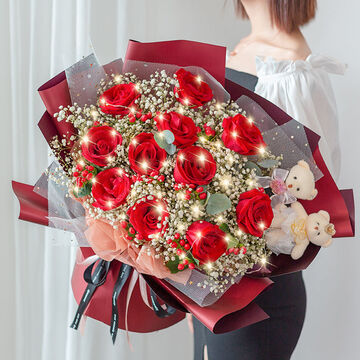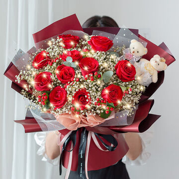 11朵红玫瑰,白色满天星丰满搭配,红豆点缀。,一条灯带,搭配2只小熊
