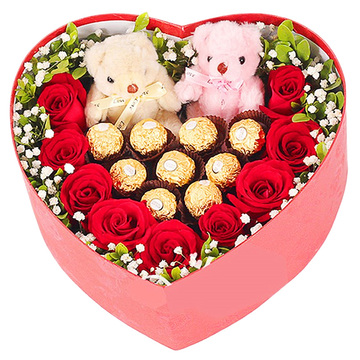 9朵红玫瑰,2只小熊,9颗费列罗巧克力,满天星、栀子叶搭配