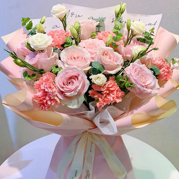 14朵粉雪山,5支粉康乃馨,4支白桔梗,尤加利间插
