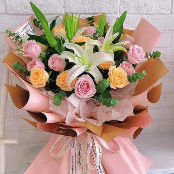 9朵粉雪山、9朵香槟玫瑰、3支多头白百合,尤加利间插
