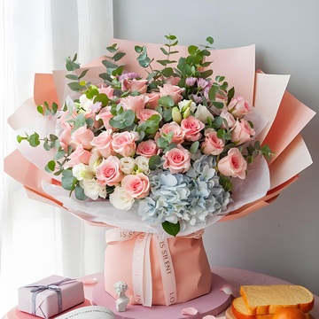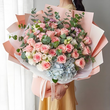戴安娜粉玫瑰33枝、白色洋桔梗5枝、粉色洋桔梗2枝、粉紫小菊3枝、浅蓝绣球1枝,尤加利10枝