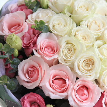 白玫瑰22枝,粉佳人粉玫瑰14枝;粉色桔梗5枝,尤加利0.5扎