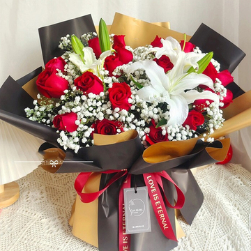 19朵红玫瑰,2支多头白百合,白色满天星丰满