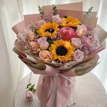 1个苹果,11朵戴安娜粉玫瑰,3支向日葵,粉色满天星丰满,尤加利间插