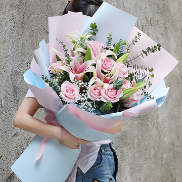 粉色+浅蓝色双面欧雅纸层次扇形包装,粉色缎带束扎花语:这一刹那迸出的光芒,将照亮你快乐的一生附送: