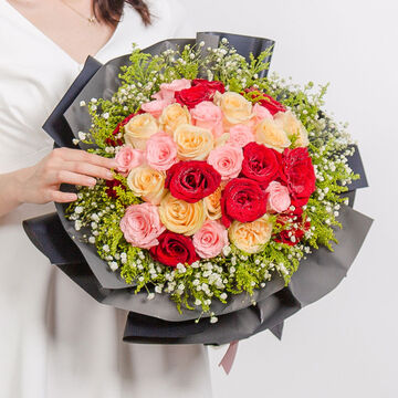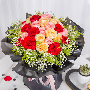 11枝卡罗拉红玫瑰、11枝戴安娜、11枝香槟搭配黄英,白色满天星