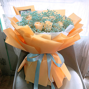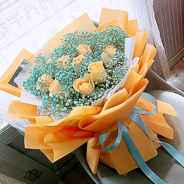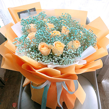 11支香槟玫瑰,蓝色满天星丰满