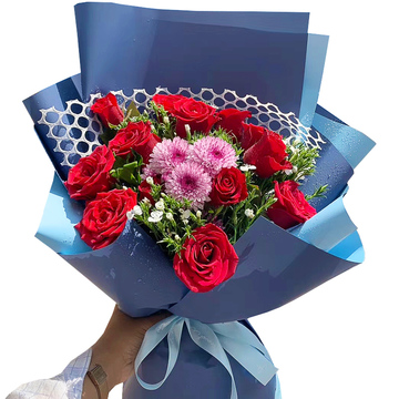 13朵红玫瑰,3支粉色小雏菊,白色石竹梅丰满间插
