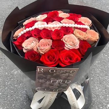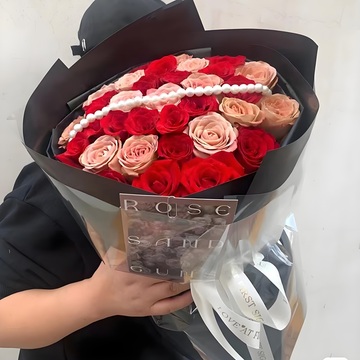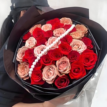 19朵红玫瑰,14朵卡布奇洛玫瑰,一串珍珠