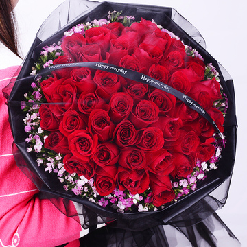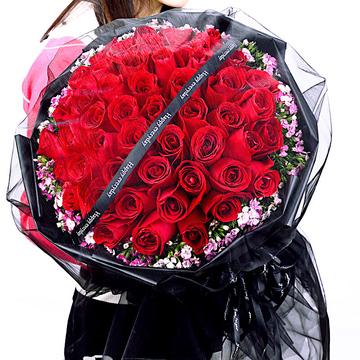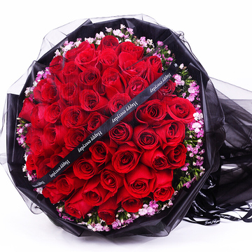 66朵红玫瑰,粉色石竹梅外围丰满围边,黑色英文丝带搭配