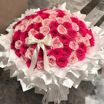 99朵弗洛伊德玫瑰和粉荔枝混搭,白色缎带蝴蝶结装饰