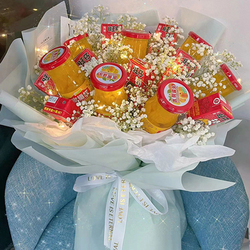 7瓶黄桃罐头,8个旺仔牛奶,白色满天星间插,一条灯带。(食品均在当地大型超市采购,可放心食用)