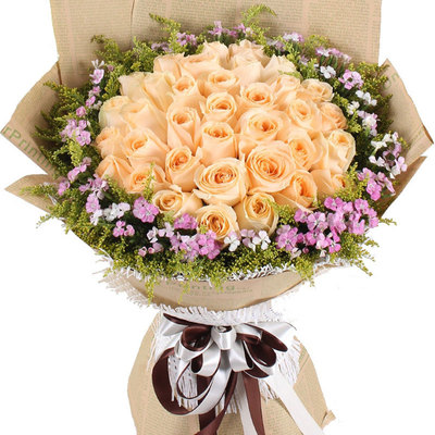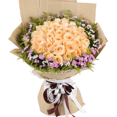 33枝香槟玫瑰,黄莺、石竹梅外围