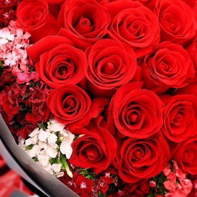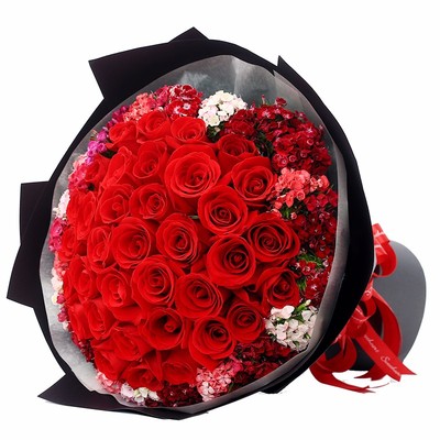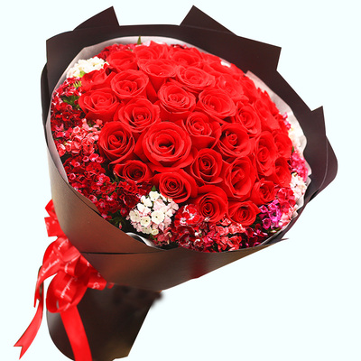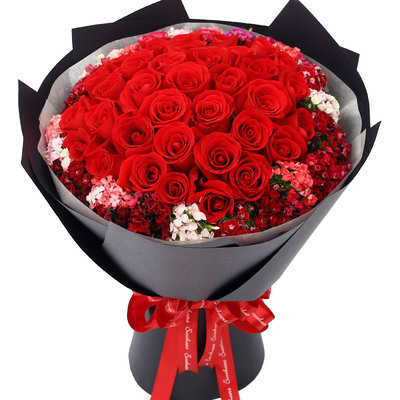 33支精品红玫瑰,外围搭配适量红色、粉色、白色石竹梅。
