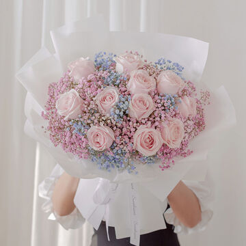 11枝粉雪山玫瑰搭配蓝色和粉色满天星