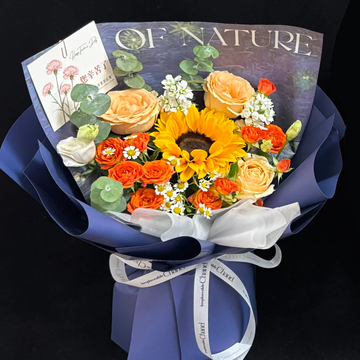 3朵香槟玫瑰,1支向日葵,5支橙芭比,1支白桔梗,2支白色紫罗兰,洋甘菊、尤加利搭配