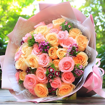 18朵戴安娜玫瑰,15朵香槟玫瑰。搭配绿叶外围点缀。