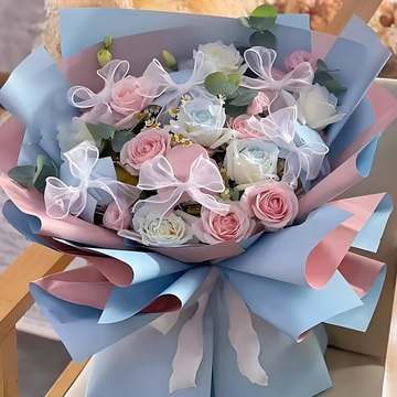 粉+蓝双面欧雅纸包装花语:什么好的我都想给你,尤其是好运,“桃”出苦难,余生都是甜!附送: