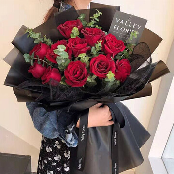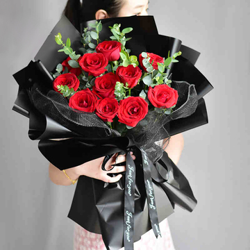 内衬黑色纱网,外层黑色防水欧雅纸层次包装,黑色英文缎带竖着花语:爱上你以后,我的字典里就没有“后悔”两个字。附送: