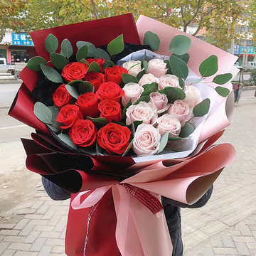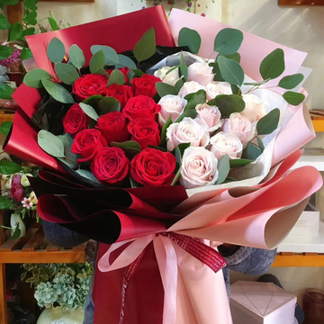 11支精品红玫瑰+11支粉佳人,搭配尤加利叶