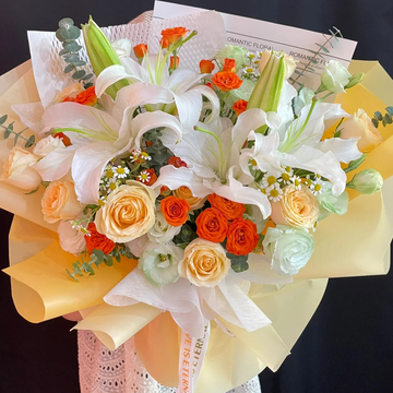 9朵香槟玫瑰,3支多头白百合,3支多头绿桔梗,5支多头橙芭比,洋甘菊、尤加利间插